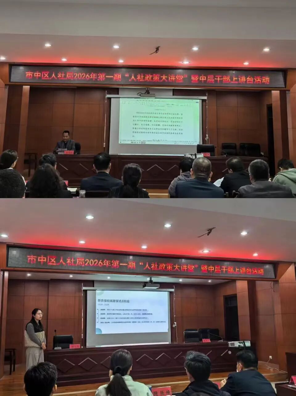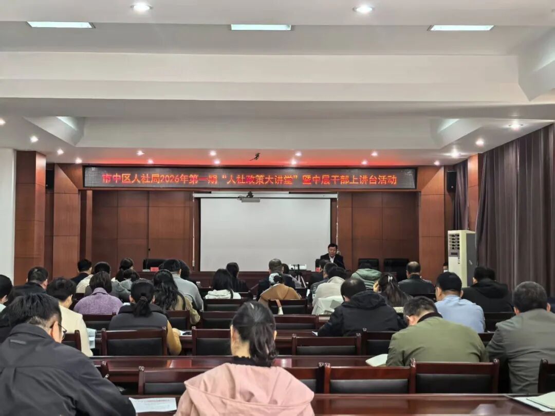 4月10日,市中区人社局召开2026年第一期“人社政策大讲堂”暨中层干部上讲台活动。区人社局全体科级干部、各科股室主要负责人参加,区人社局党组书记、局长、四级调研员刘立人同志主持。